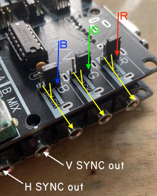 As with the 2.0, 3.0 has three assignable jacks. Without jumpers, they aren’t connected to anything. The picture above shows a convenient jumper configuration that connects each of the assignable jacks directly to a corresponding VGA color pin. In this way, they can function as inputs (send a hot enough signal in and you’ll see some signal on that color) OR outputs (connect the jack to an amplified speaker and you’ll hear whatever signal is present on that color). While jumpered like the above pic, there’s an extra jack pin that allows you to simultaneously patch the jacks to something else too.