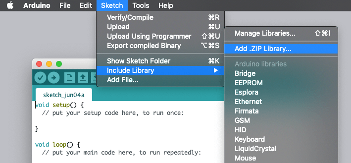 - Click the “Sketch” menu, then hover over “Include Library”, and then click “Add .ZIP Library”