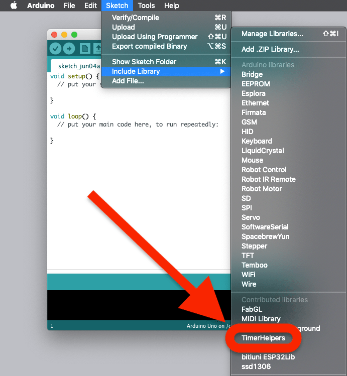 5) The library should be installed now. You can double check by clicking on the “Sketch” menu again and then hovering over “Include Library” again. TimerHelpers should be in the “Contributed libraries” list. You don’t need to click on it or anything — just make sure it’s there. If it’s there, you’re all set — you never need to do this again.
