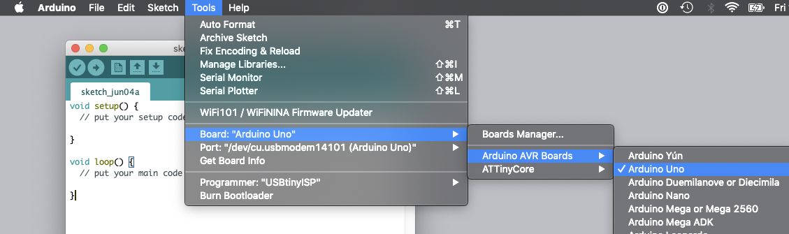 - Click on the “Tools” menu, then navigate through “Board” > Arduino AVR Boards and make sure “Arduino Uno” is selected.