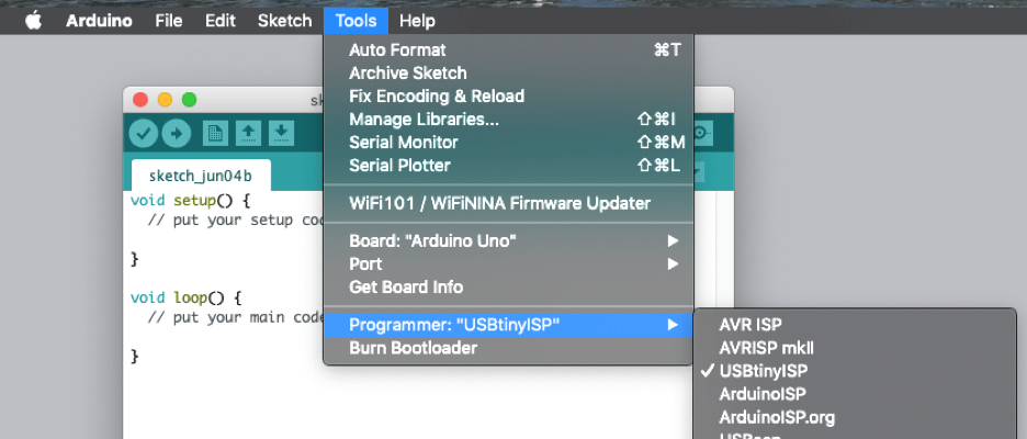 Programming is done the same way, but you just select the programmer (USBTinyISP) from the “Tools” menu: